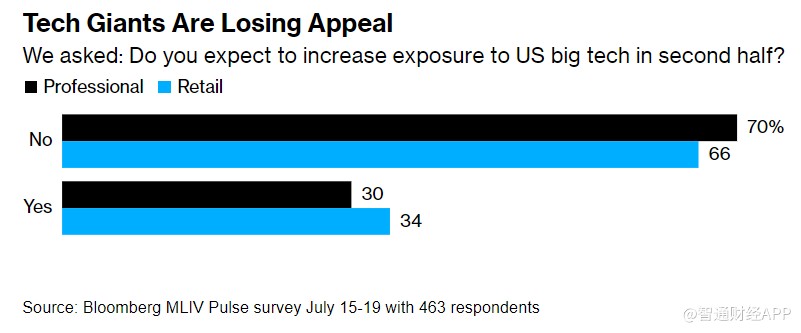估值过高(尤其是科技股)也令投资者感到担忧。考虑到这一点,约70%的受访者表示,他们没有计划在今年下半年增加对美国大型科技公司的投资。